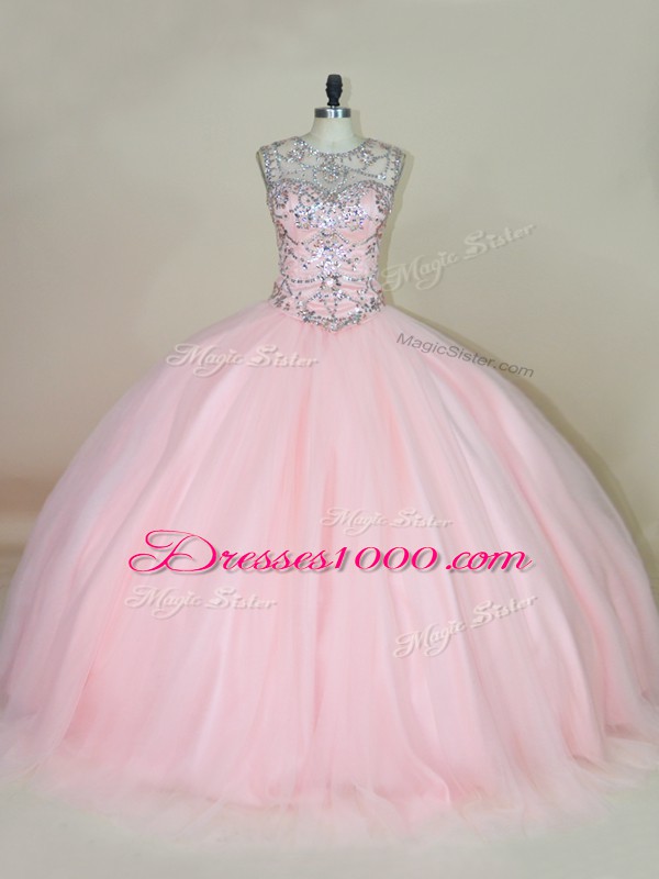 Super Baby Pink Sleeveless Beading Lace Up Quinceanera Gowns