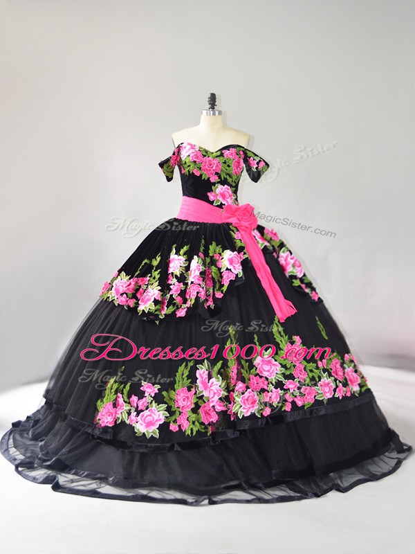 Black Sleeveless Embroidery Lace Up Quince Ball Gowns