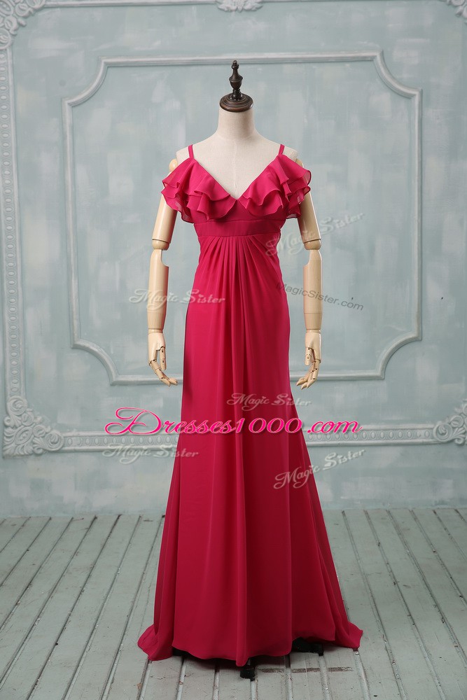 Zipper Evening Outfits Hot Pink for Prom and Party and Military Ball with Ruching Brush Train
