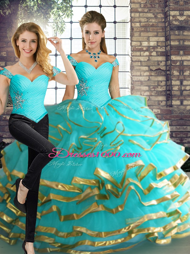 Wonderful Floor Length Lace Up Sweet 16 Dresses Aqua Blue for Military Ball and Sweet 16 and Quinceanera with Beading and Ruffled Layers