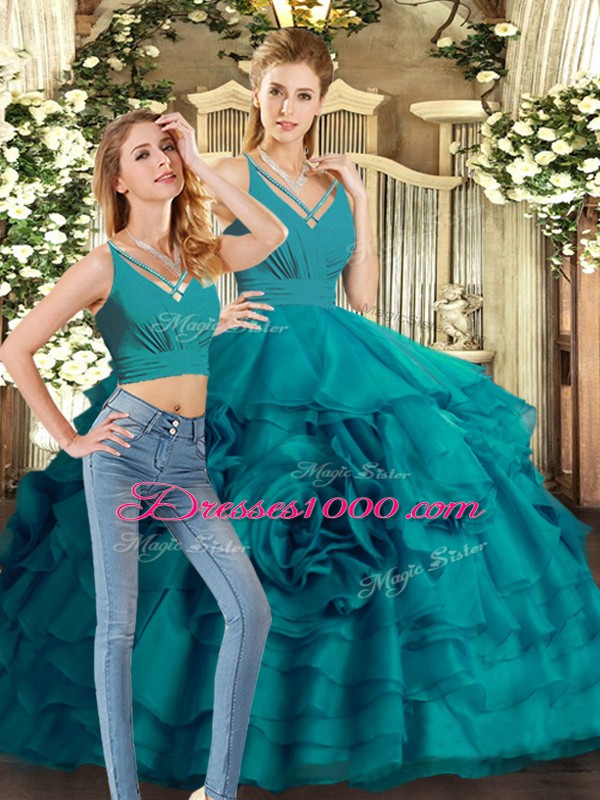 Teal Organza Backless V-neck Sleeveless Quinceanera Dresses Sweep Train Ruffled Layers