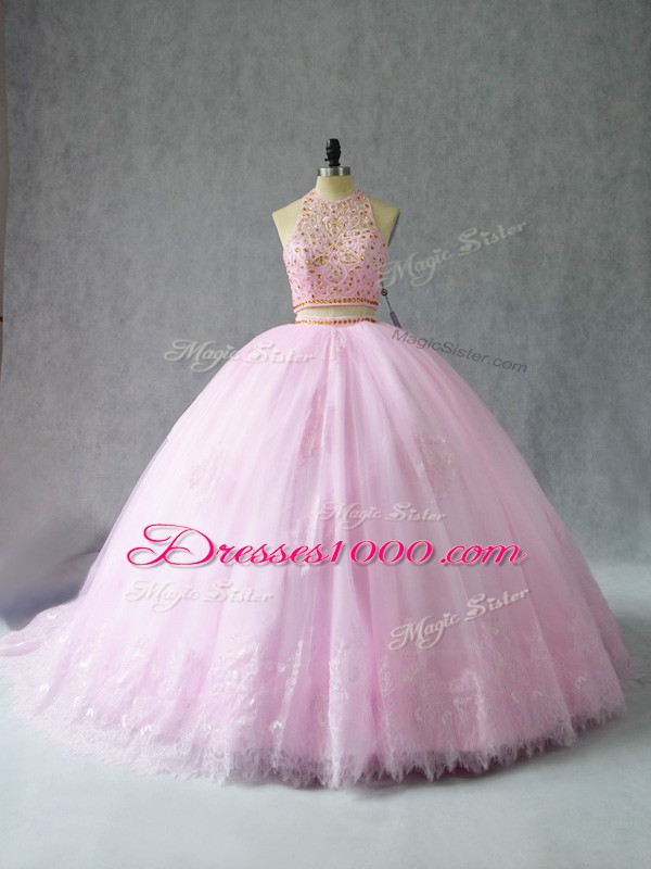 Excellent Baby Pink Sweet 16 Quinceanera Dress Halter Top Sleeveless Court Train Zipper
