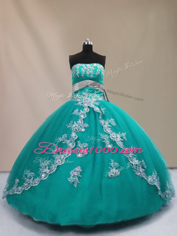 Custom Designed Turquoise Ball Gowns Appliques Sweet 16 Quinceanera Dress Lace Up Tulle Sleeveless Floor Length