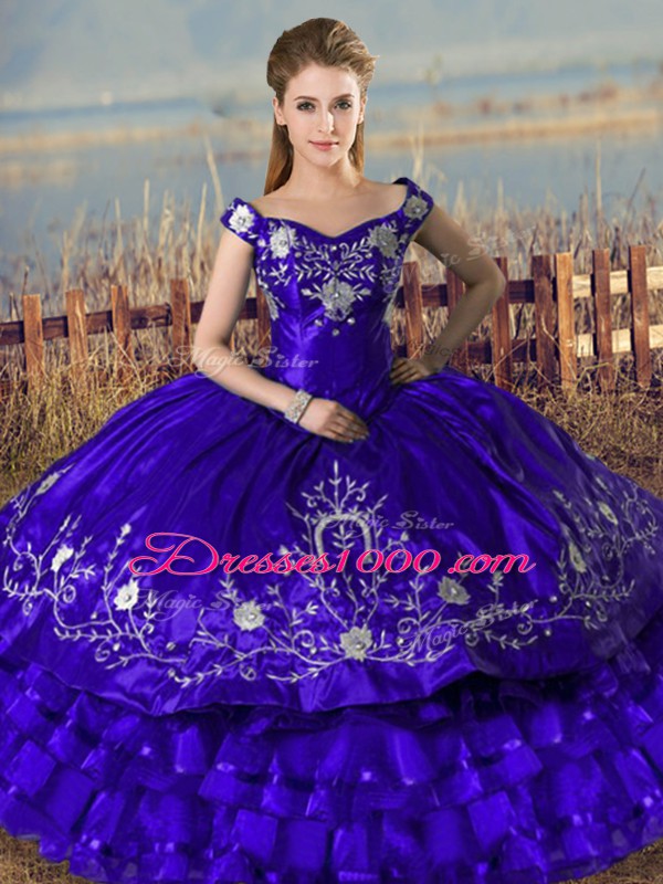 Fabulous Sleeveless Floor Length Embroidery and Ruffled Layers Lace Up Quinceanera Dress with Purple