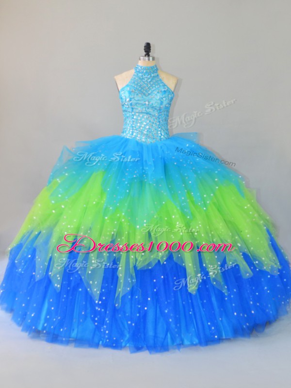 Gorgeous Multi-color Ball Gowns Beading and Ruffles Ball Gown Prom Dress Lace Up Tulle Sleeveless Floor Length