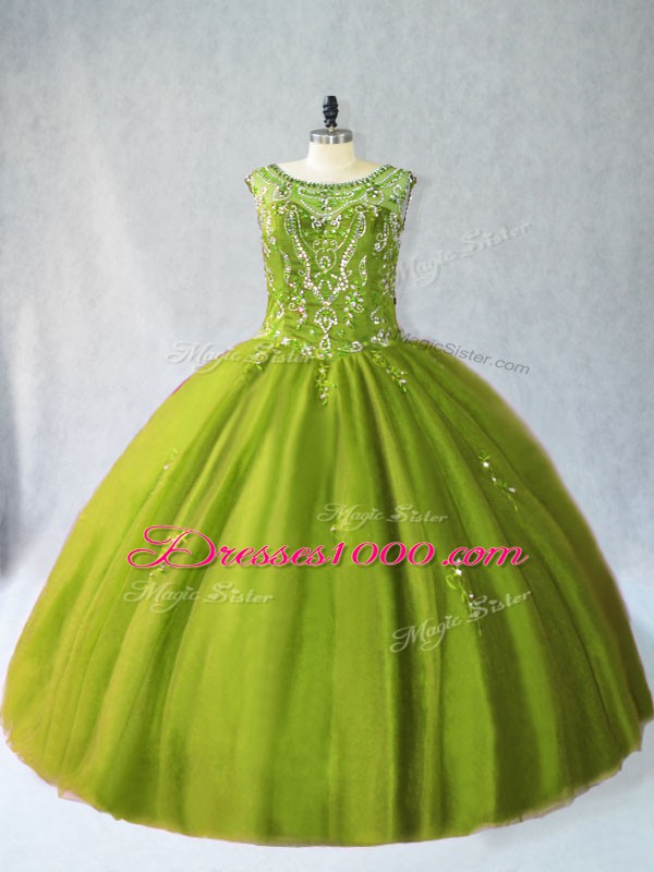 Best Sleeveless Floor Length Beading Lace Up 15 Quinceanera Dress with Olive Green