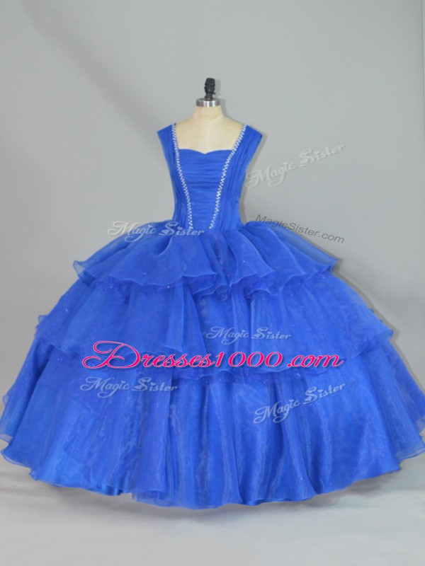 Charming Floor Length Lace Up Ball Gown Prom Dress Blue for Sweet 16 and Quinceanera with Beading and Ruffled Layers