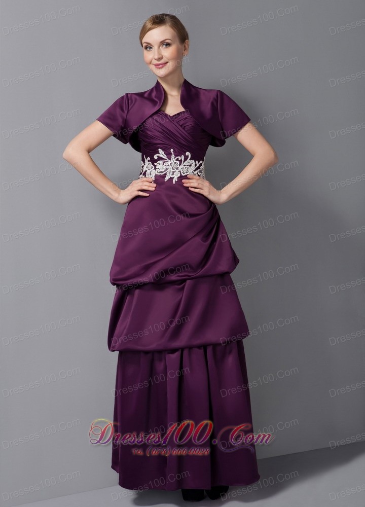This gorgeous strapless dress is sure to work wonders for any figure! Its tuck-sculpted design is nicely enhanced by the lustrous quality of its chic material. Dramatic pleats radiate across the sweetheart neckline bodice. The floor-length skirt has a cupcake shape that adds its overal fullness. The floral applique highlights the mid-section and everything`s topped off by a matching, short-sleeved bolero.