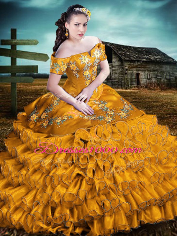 Organza Off The Shoulder Sleeveless Lace Up Embroidery and Ruffles Vestidos de Quinceanera in Brown