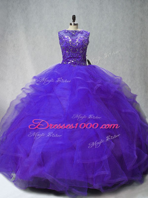 Great Purple Ball Gowns Scoop Sleeveless Tulle Brush Train Lace Up Beading and Ruffles 15 Quinceanera Dress
