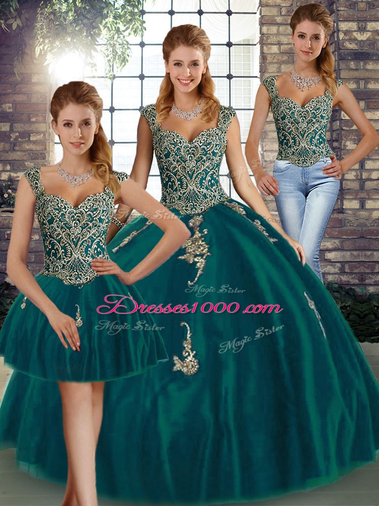 Sweet Beading and Appliques Quinceanera Gowns Peacock Green Lace Up Sleeveless Floor Length