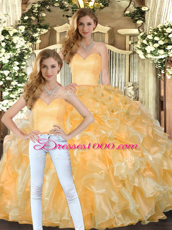 Customized Gold Two Pieces Sweetheart Sleeveless Organza Floor Length Lace Up Beading and Ruffles Sweet 16 Dresses