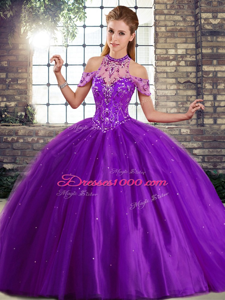 Purple Ball Gowns Beading Sweet 16 Quinceanera Dress Lace Up Tulle Sleeveless