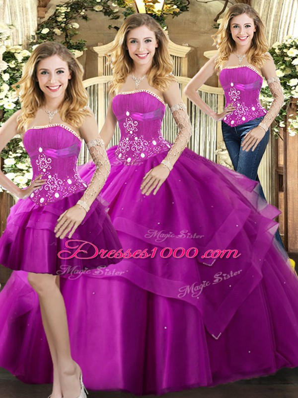 Custom Fit Strapless Sleeveless 15th Birthday Dress Floor Length Beading and Ruffled Layers Fuchsia Tulle