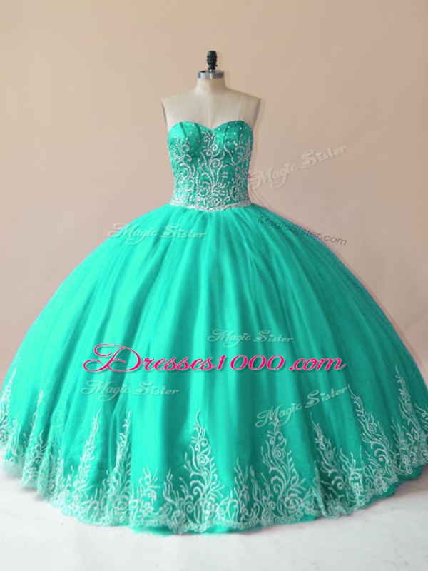 Free and Easy Tulle Sweetheart Sleeveless Lace Up Embroidery Quince Ball Gowns in Turquoise