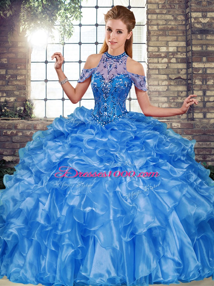 Romantic Floor Length Blue Quince Ball Gowns Organza Sleeveless Beading and Ruffles