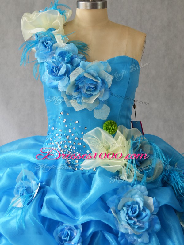 One Shoulder Sleeveless Sweet 16 Dress Floor Length Pick Ups and Hand Made Flower Baby Blue Organza