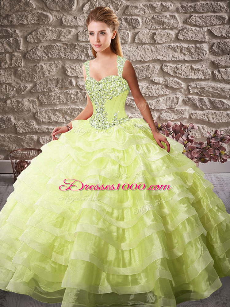 Straps Sleeveless Court Train Lace Up Ball Gown Prom Dress Yellow Green Organza