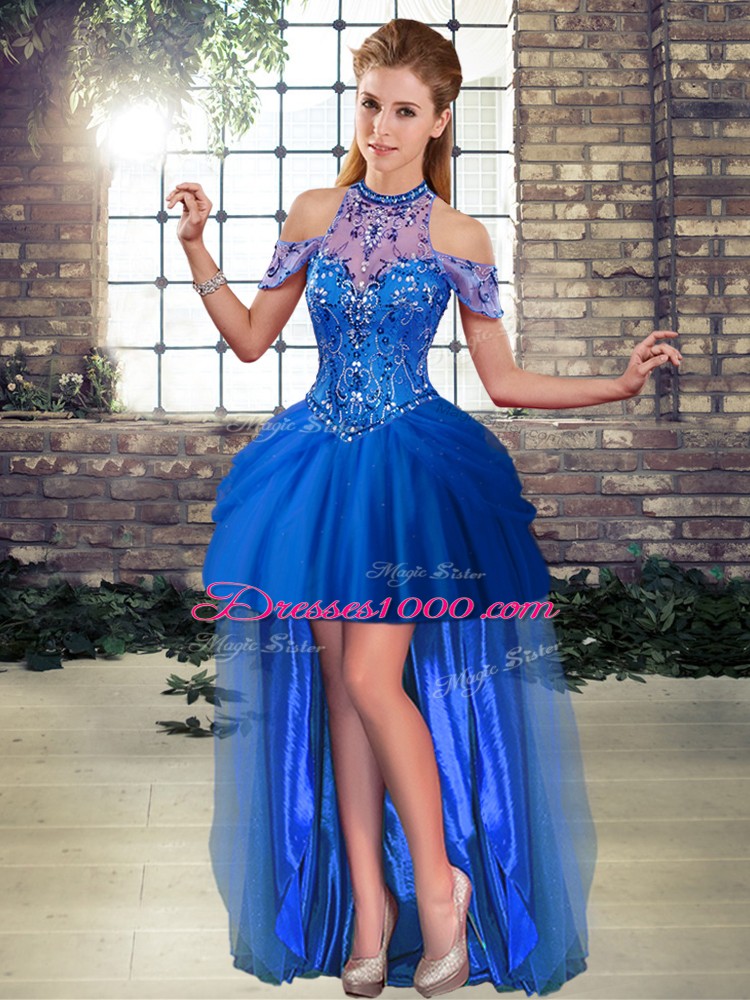 Designer Royal Blue Sleeveless Beading High Low Winning Pageant Gowns