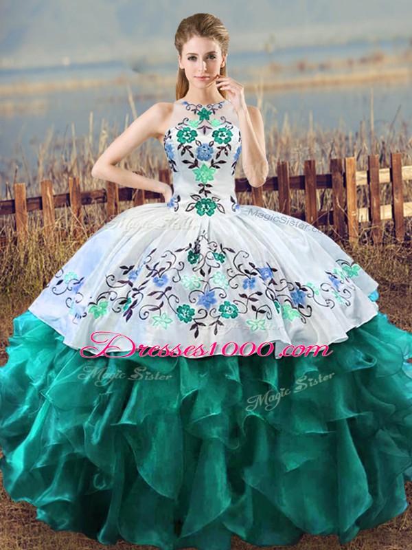 Comfortable Turquoise Lace Up Halter Top Embroidery and Ruffles Quinceanera Gown Organza Sleeveless