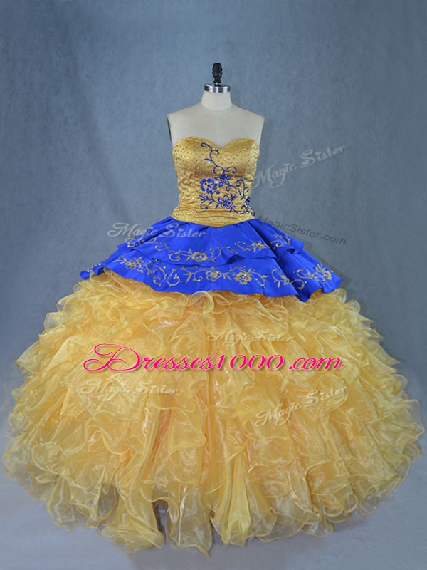 Fine Gold Ball Gowns Embroidery and Ruffles Quince Ball Gowns Lace Up Organza Sleeveless