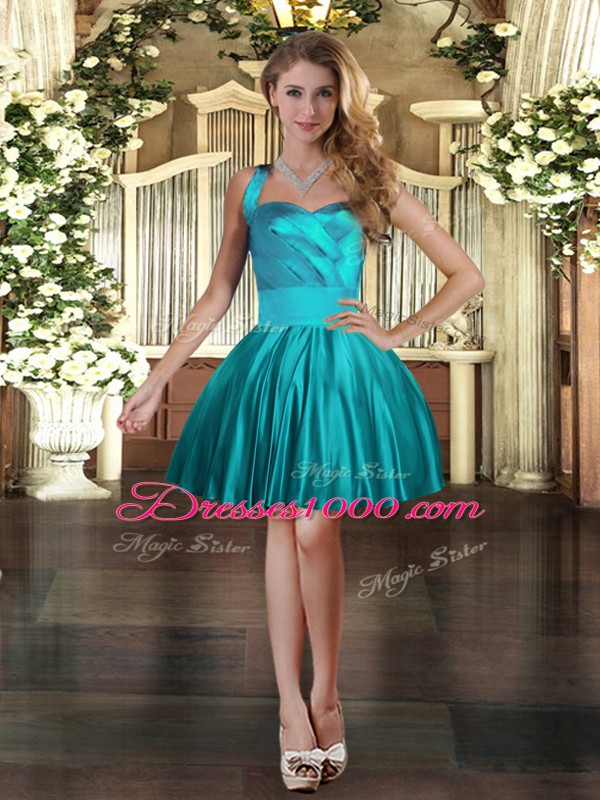 Hot Selling Halter Top Sleeveless Custom Made Mini Length Ruching Teal Satin