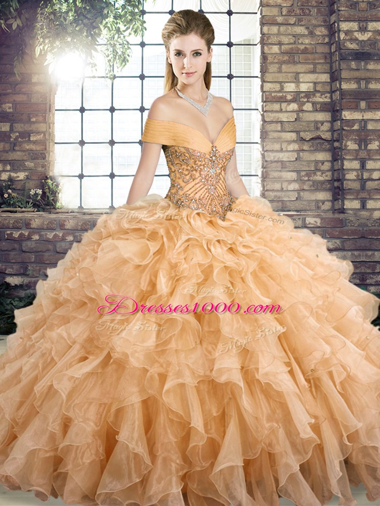 Brush Train Ball Gowns Quinceanera Gown Gold Off The Shoulder Organza Sleeveless Lace Up