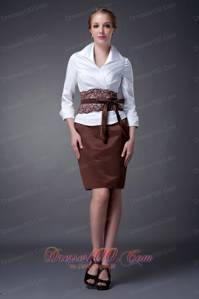 Belt Collar Lace Sleeves White Brown Mothers Dresses
