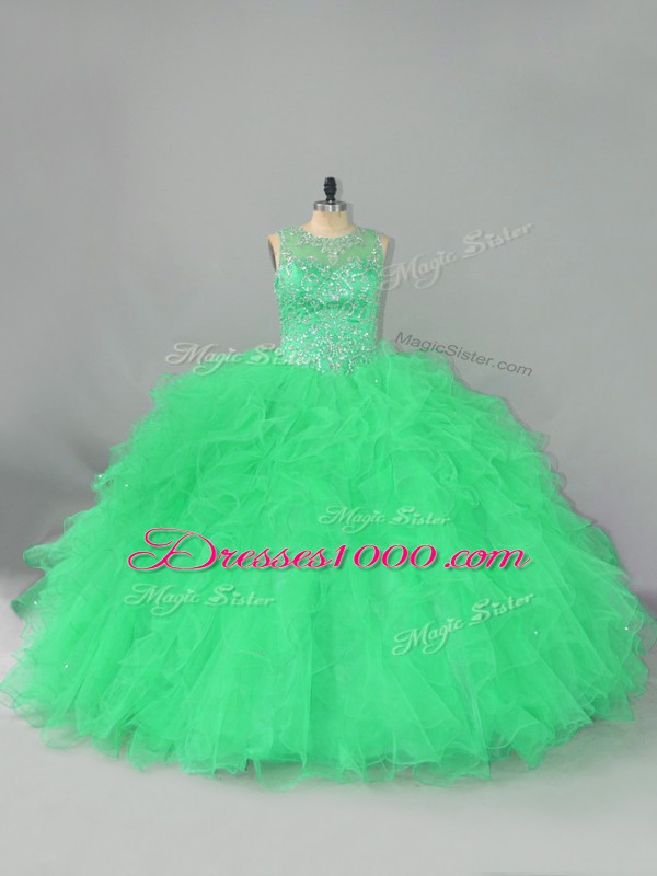 Green Sleeveless Floor Length Beading and Ruffles Lace Up 15th Birthday Dress