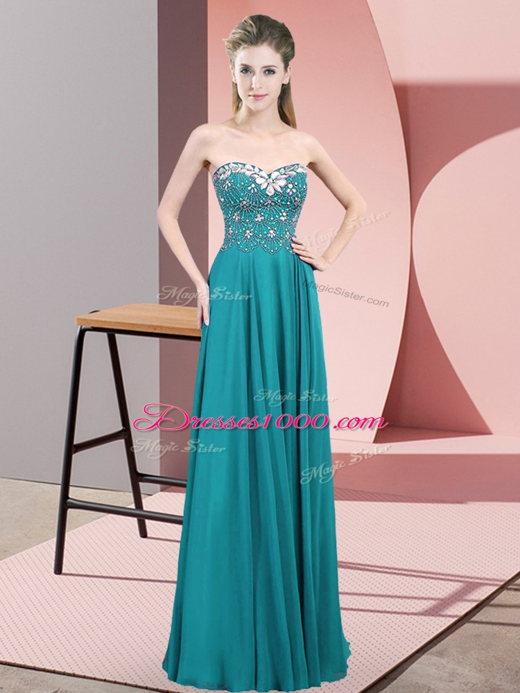 Beading Prom Dress Teal Zipper Sleeveless Floor Length