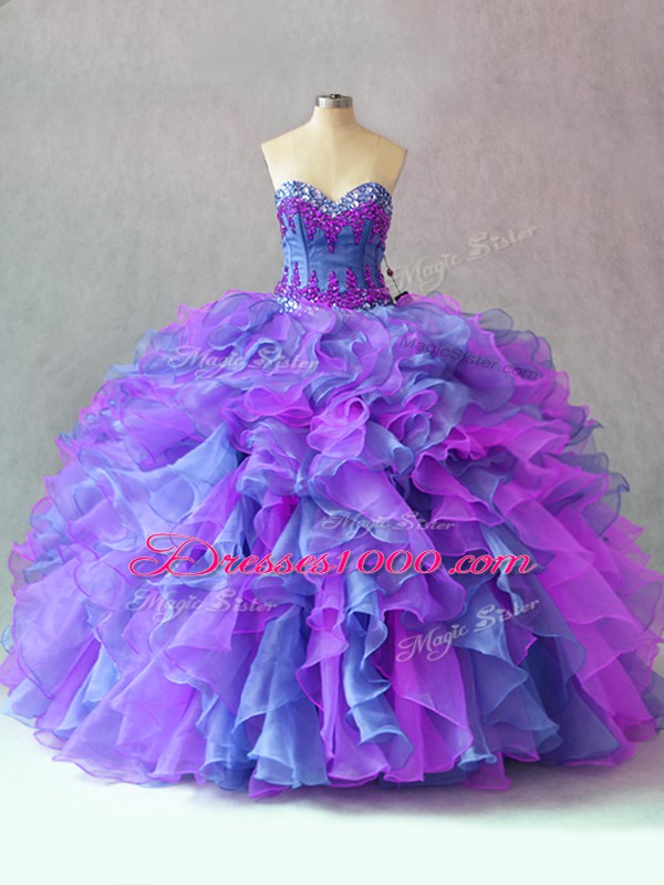 Sumptuous Sleeveless Floor Length Beading and Appliques and Ruffles Lace Up 15th Birthday Dress with Multi-color