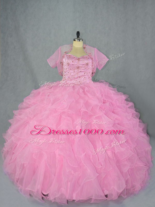 Glorious Baby Pink Ball Gowns Sweetheart Sleeveless Organza Floor Length Lace Up Beading and Ruffles Quinceanera Gowns