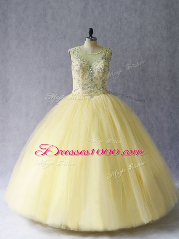 Light Yellow Tulle Lace Up Sweet 16 Dress Sleeveless Floor Length Beading