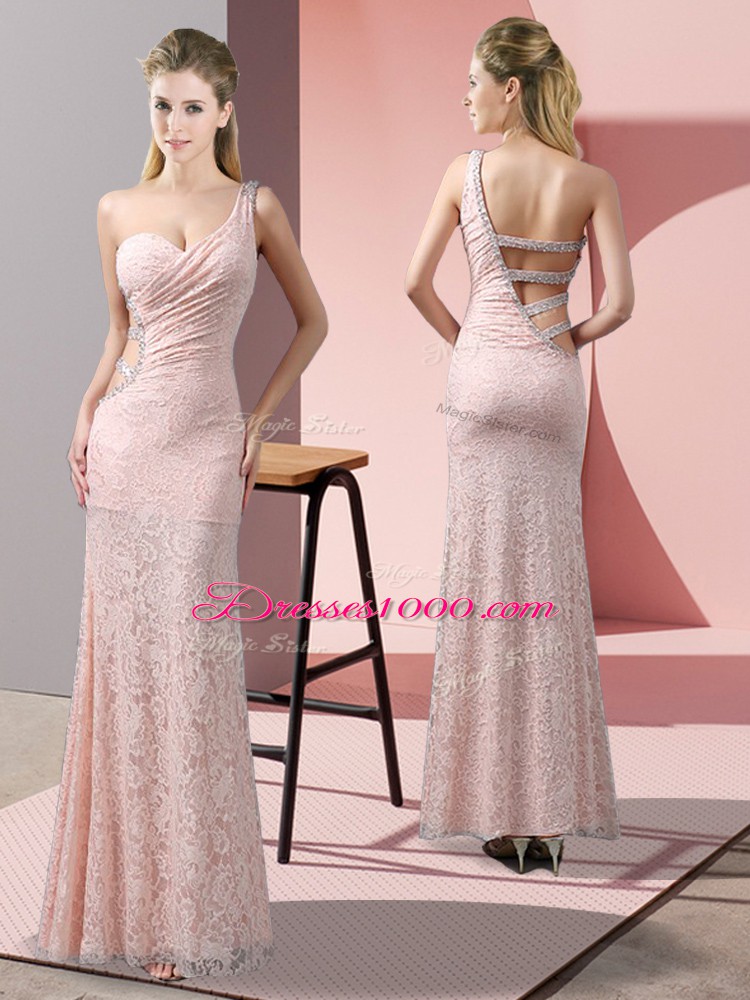 Baby Pink Lace Criss Cross One Shoulder Sleeveless Floor Length Pageant Dress Toddler Beading and Lace