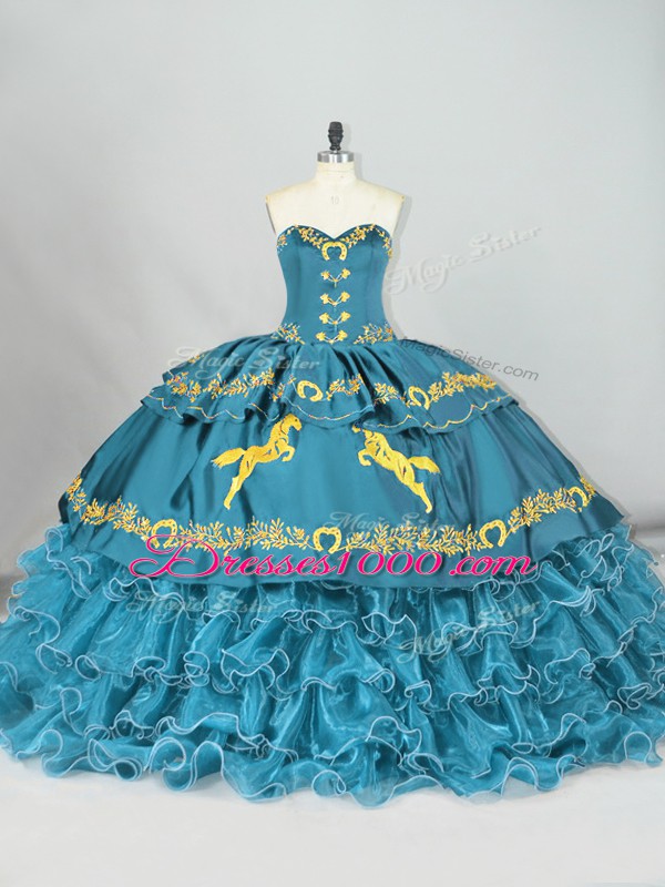 Teal Satin and Organza Lace Up Quinceanera Dress Sleeveless Brush Train Embroidery and Ruffled Layers