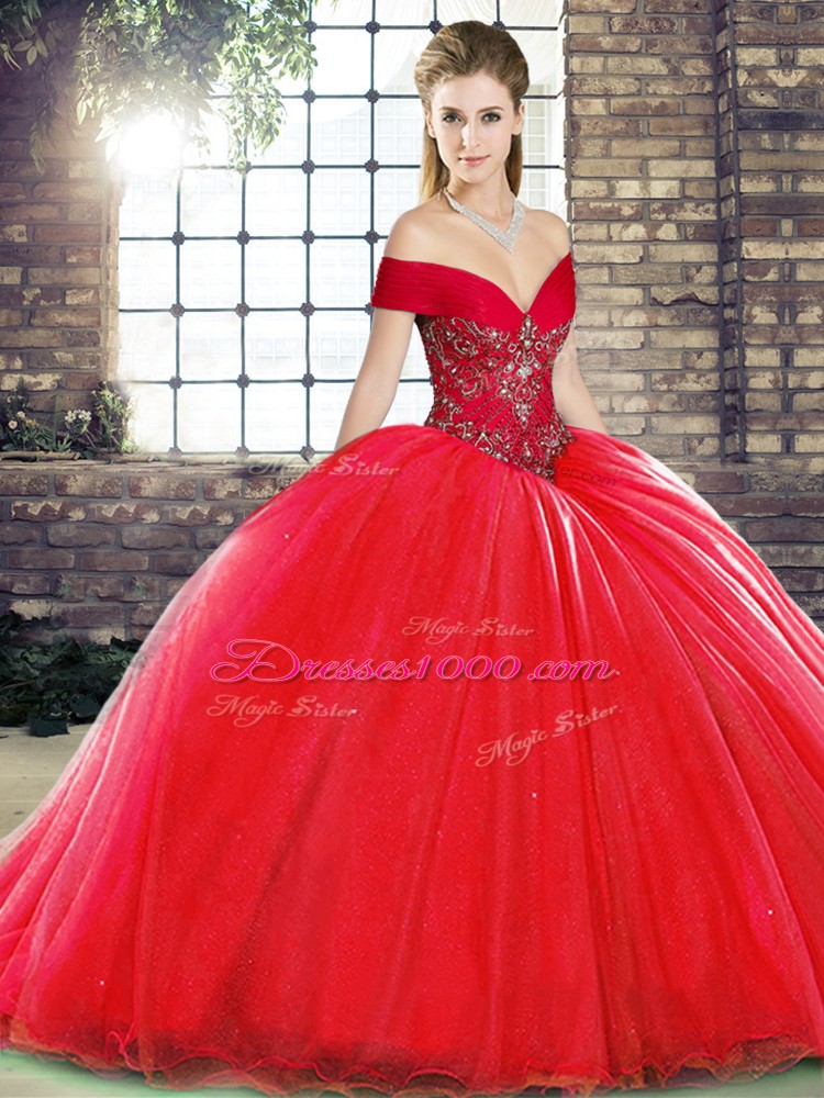 Red Off The Shoulder Lace Up Beading Quinceanera Gown Brush Train Sleeveless