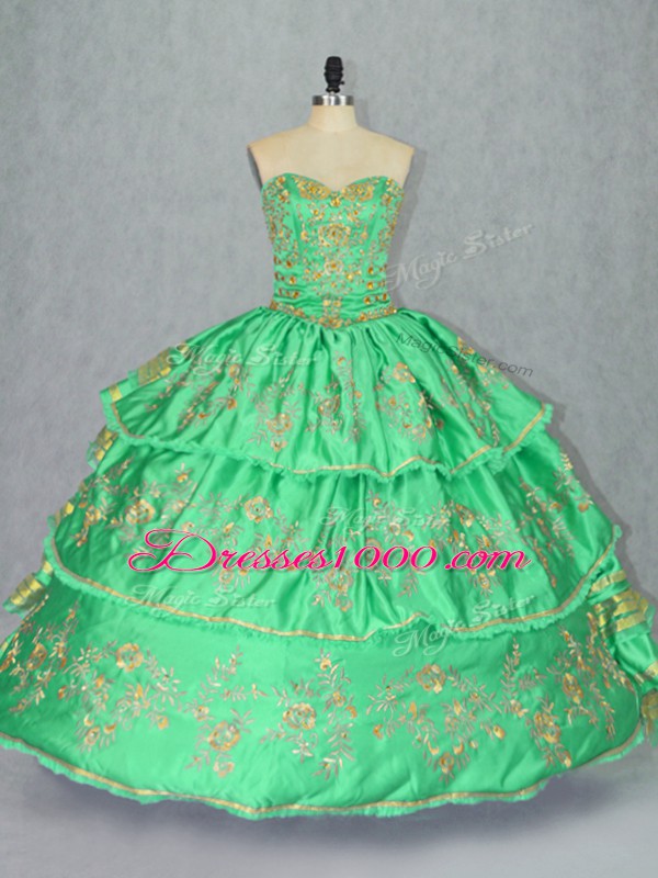 Satin and Organza Sweetheart Sleeveless Lace Up Embroidery and Ruffled Layers Sweet 16 Quinceanera Dress in Green