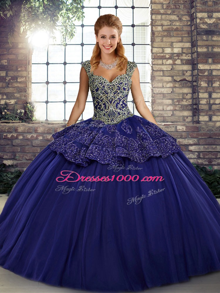 Luxury Ball Gowns 15 Quinceanera Dress Purple Straps Tulle Sleeveless Floor Length Lace Up