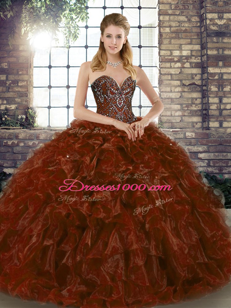 Excellent Sleeveless Floor Length Beading and Ruffles Lace Up Sweet 16 Dress with Brown