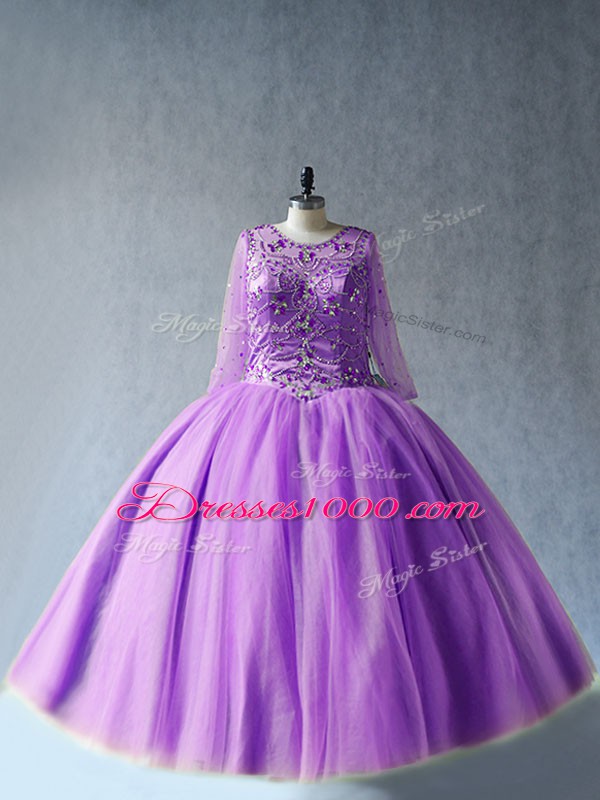 Luxury Long Sleeves Tulle Floor Length Lace Up 15 Quinceanera Dress in Lavender with Beading