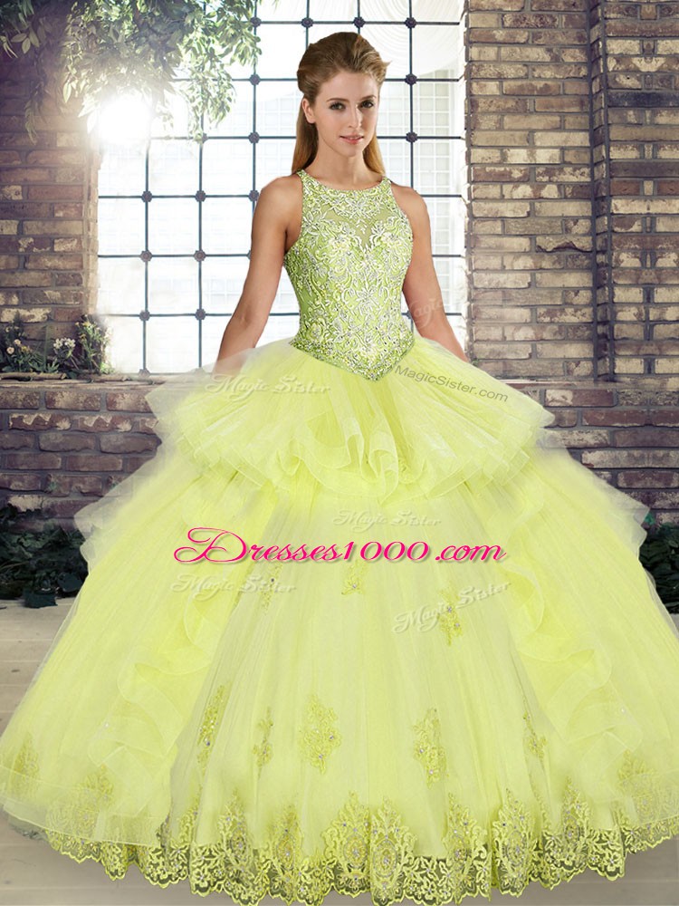 Customized Yellow Sleeveless Floor Length Lace and Embroidery and Ruffles Lace Up Quinceanera Gowns