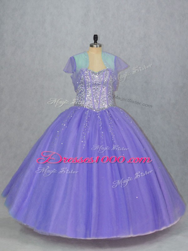 Fine Lavender Ball Gowns Sweetheart Sleeveless Tulle Floor Length Lace Up Beading Quince Ball Gowns