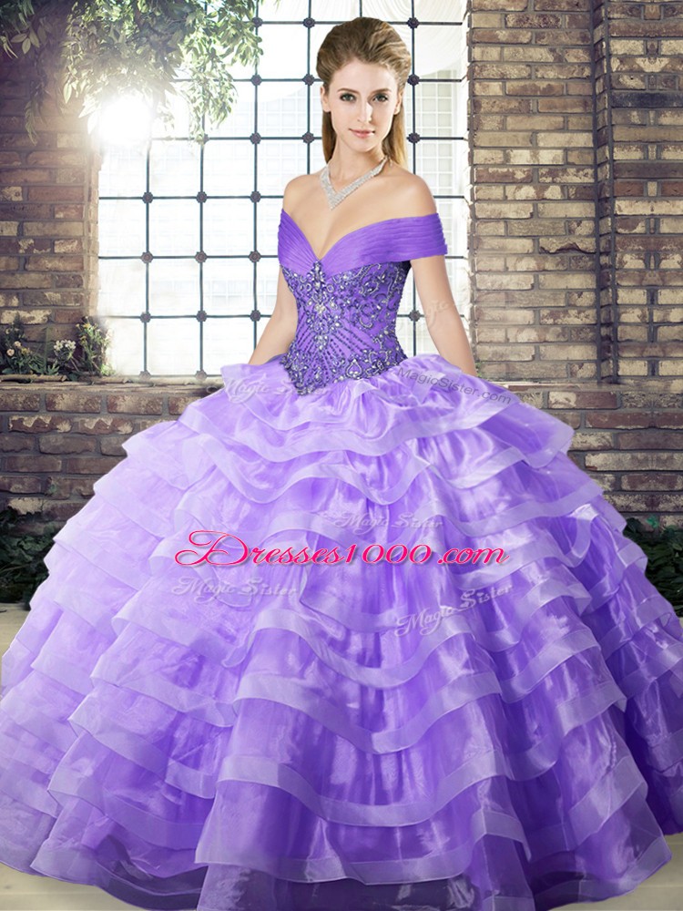 Off The Shoulder Sleeveless Brush Train Lace Up Quinceanera Dresses Lavender Organza