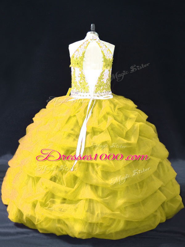 Free and Easy Gold Ball Gowns Appliques and Pick Ups Quinceanera Dress Backless Organza Sleeveless Floor Length
