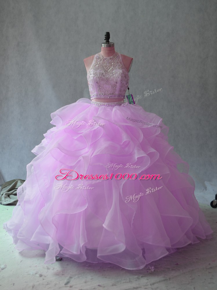 Organza Halter Top Sleeveless Backless Beading and Ruffles Quinceanera Gowns in Lilac