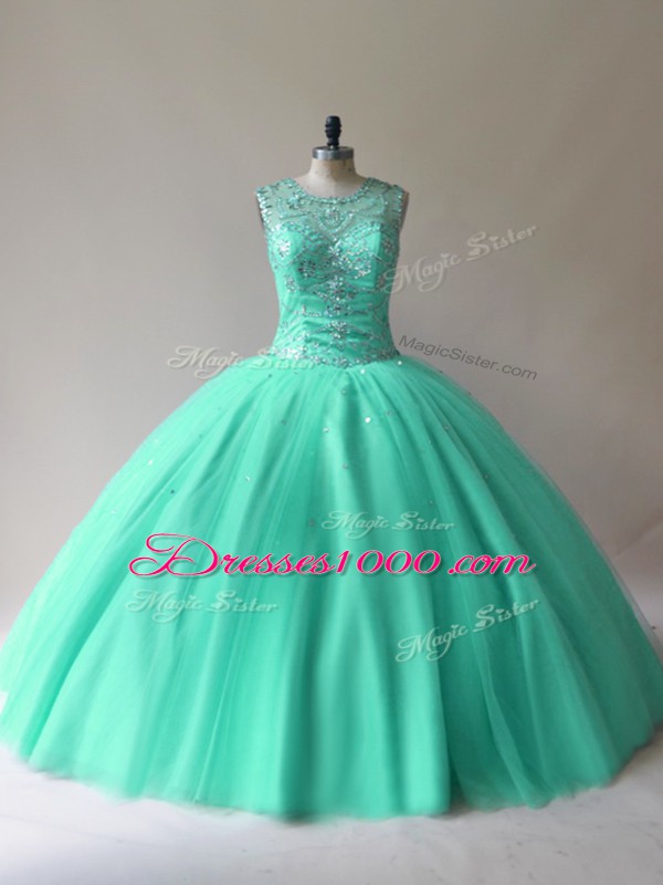 Modern Floor Length Aqua Blue Quinceanera Gown Tulle Sleeveless Beading
