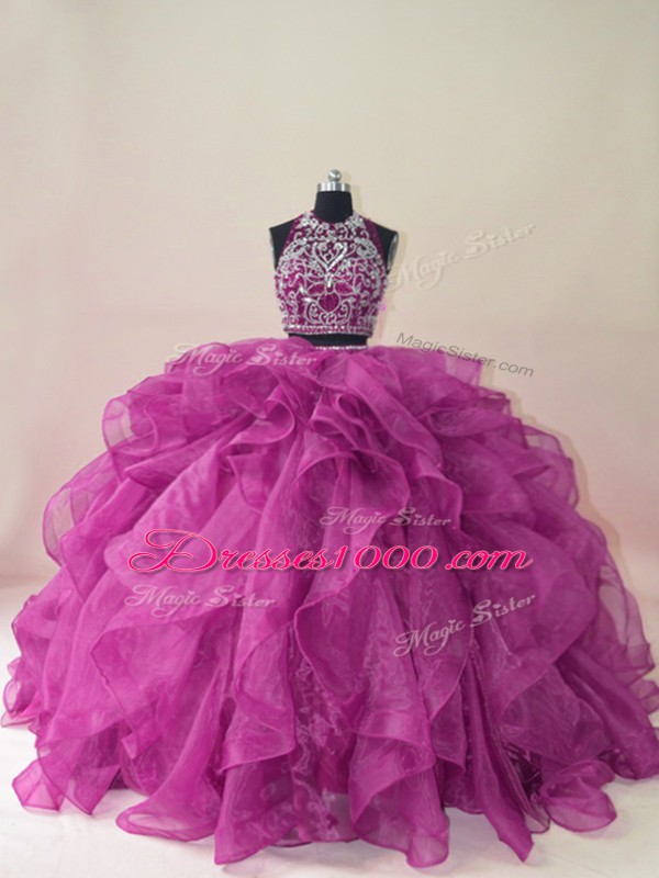 Fuchsia Scoop Neckline Beading and Ruffles Quinceanera Dress Sleeveless Backless