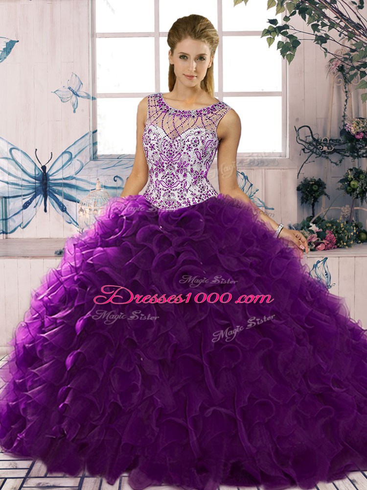 Floor Length Lace Up Quinceanera Dresses Purple for Military Ball and Sweet 16 and Quinceanera with Beading and Ruffles