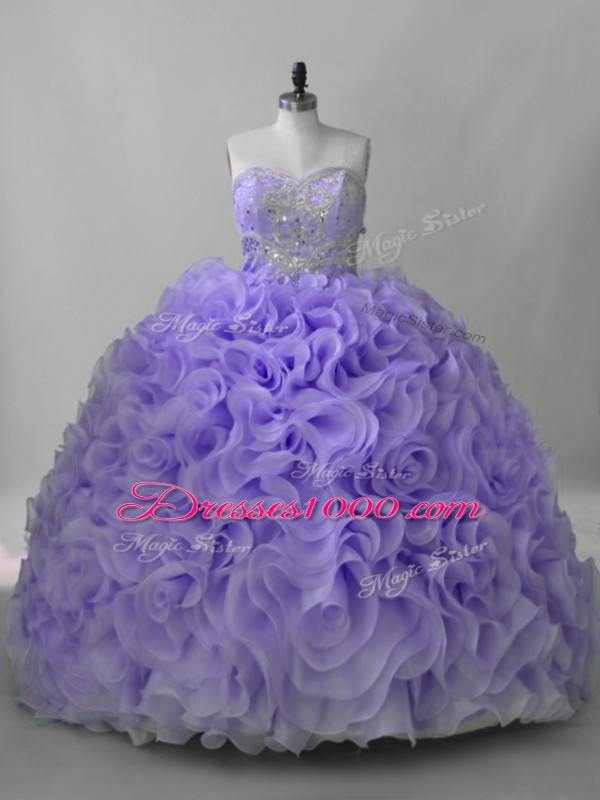 High Class Lavender Lace Up Sweetheart Beading Quinceanera Dresses Fabric With Rolling Flowers Sleeveless Brush Train