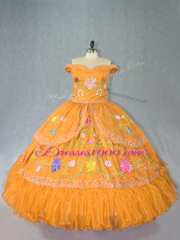 Organza Off The Shoulder Sleeveless Lace Up Embroidery Vestidos de Quinceanera in Gold